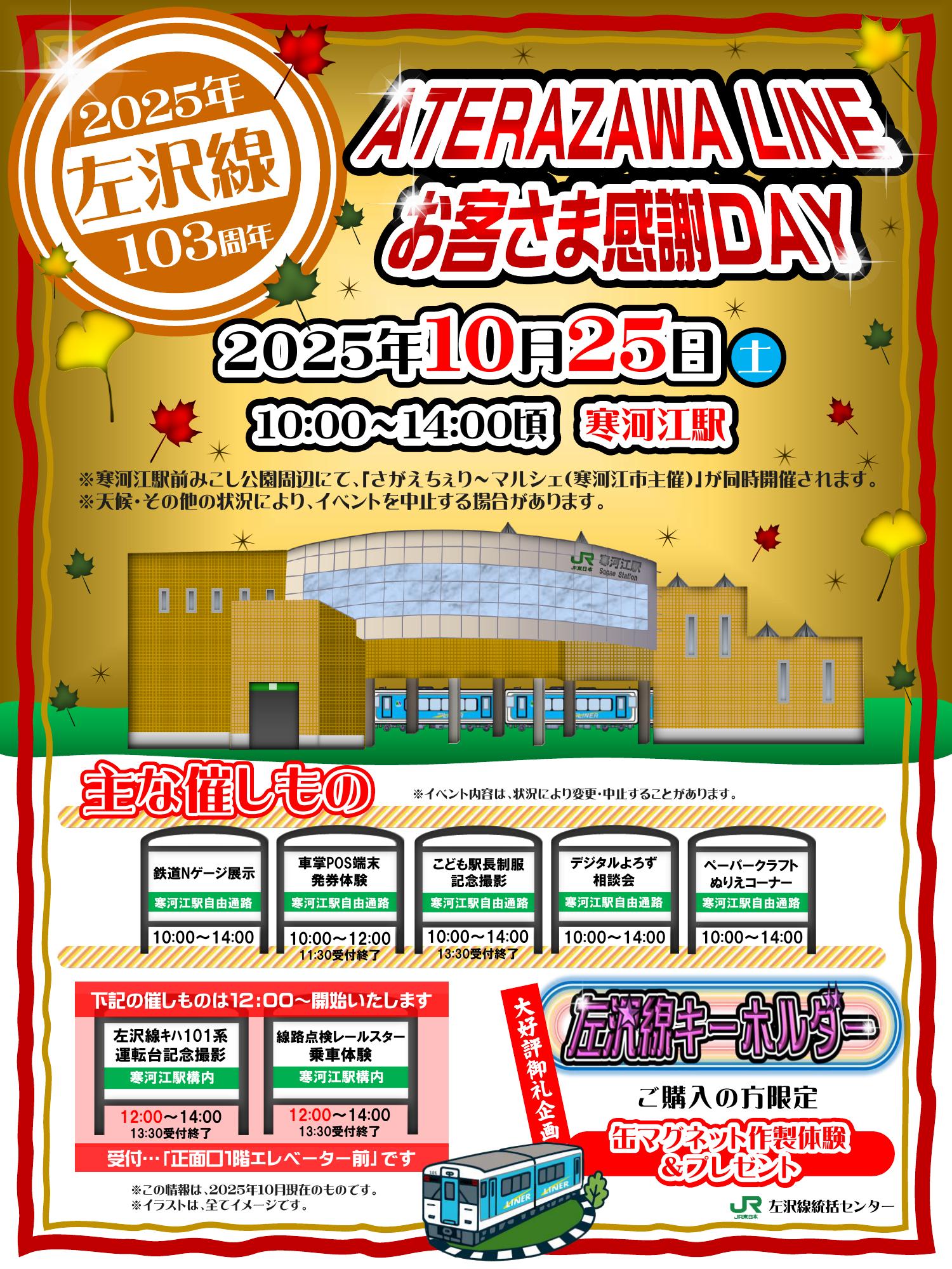「お客さま感謝DAY」では、人気のレールスター乗車体験やキハ101系運転台記念撮影など多彩なコンテンツをご用意。左沢線の魅力と鉄道の日イベントを満喫できる1日です。仮装して寒河江駅へ、鉄道とハロウィンを楽しみに出かけましょう!