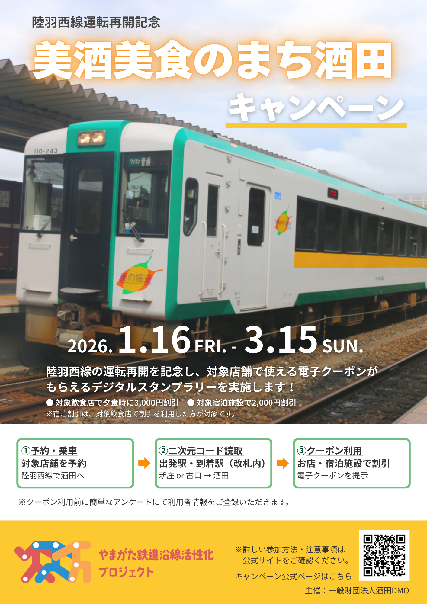 2026年1月16日(金)の陸羽西線運転再開を機に、「陸羽西線運転再開記念 美酒美食のまち酒田キャンペーン」を実施します!