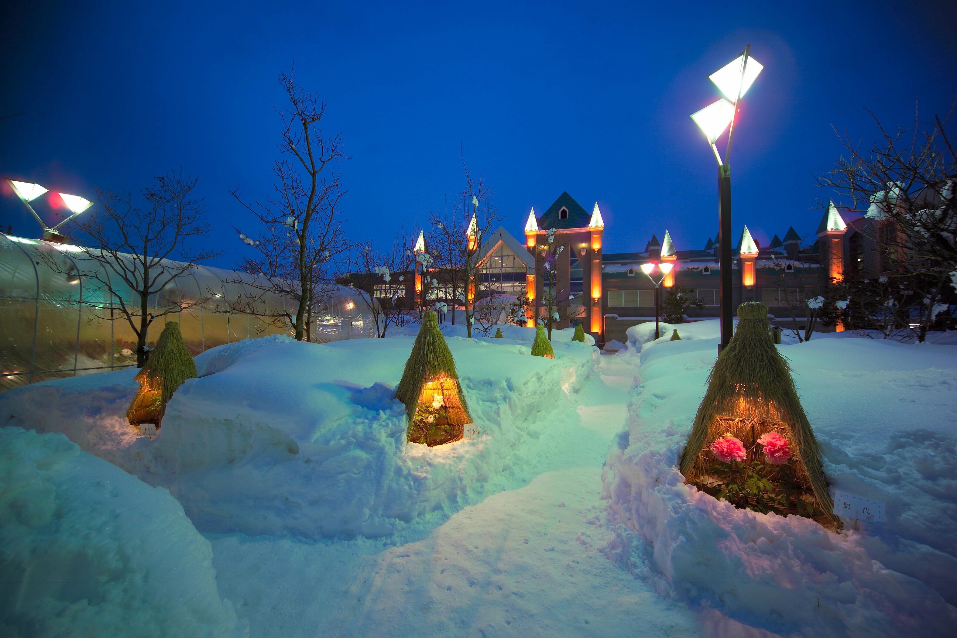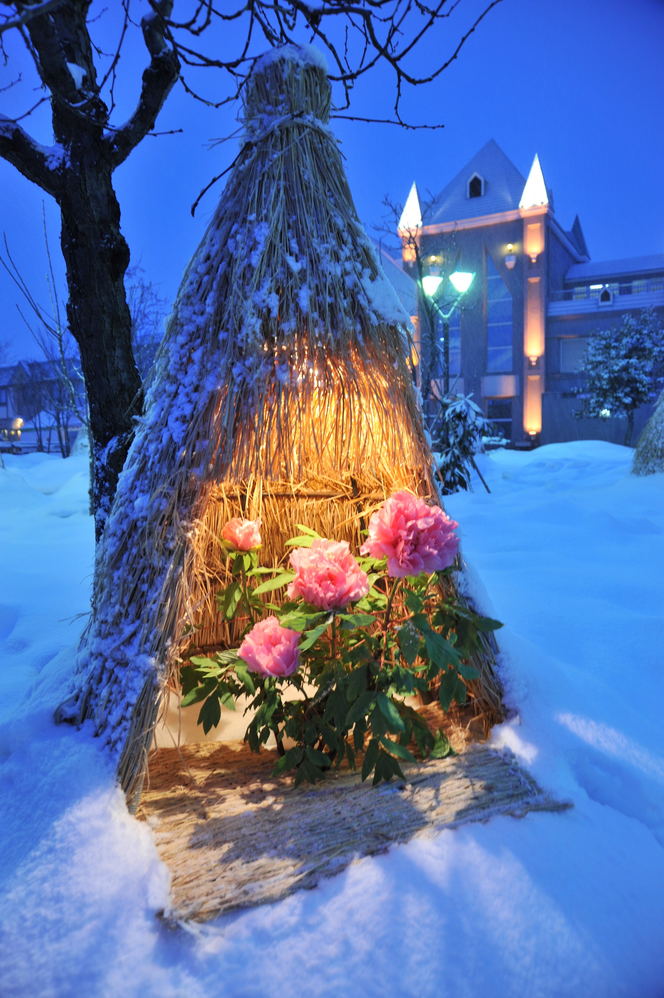 牡丹は、高さ約120cmのわらで編んだ「こも」と呼ばれるカサのなかに飾られ、真っ白な雪の中に、色とりどりの大輪の牡丹が綺麗に花を咲かせます。