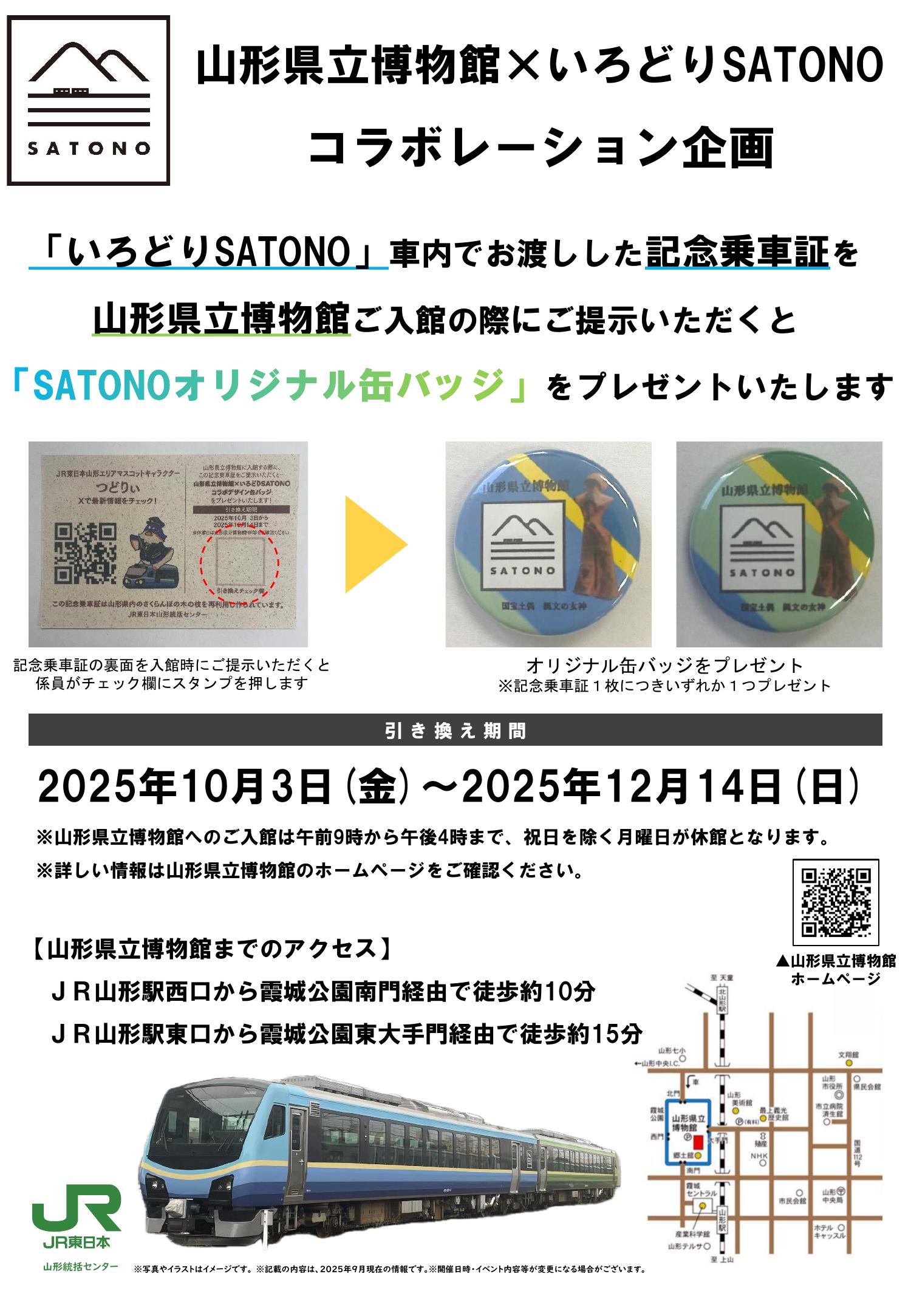 「いろどりSATONO」車内でお渡しした記念乗車証を山形県立博物館ご入館の際にご提示いただくと「SATONOオリジナル缶バッジ」をプレゼントいたします。