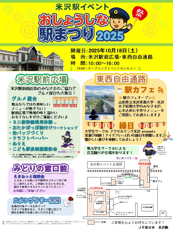 日頃より米沢駅をご利用いただいているお客さま、そして地域の皆さまへの感謝の気持ちを込めて、米沢駅社員が心を込めて企画いたしました。縁日やグルメ屋台、ミニ新幹線など、家族で楽しめる企画が盛りだくさんですのでぜひお越しください。
