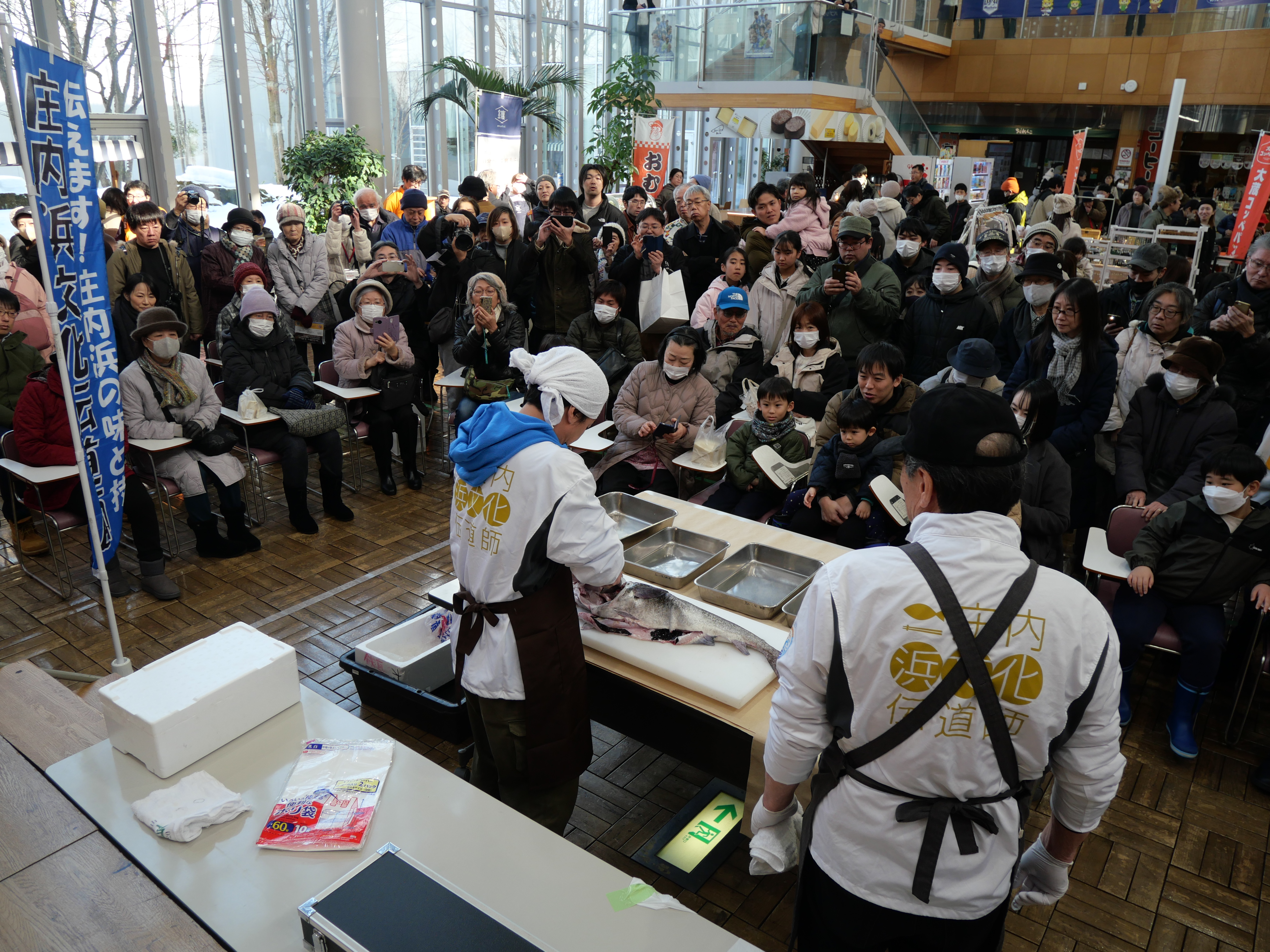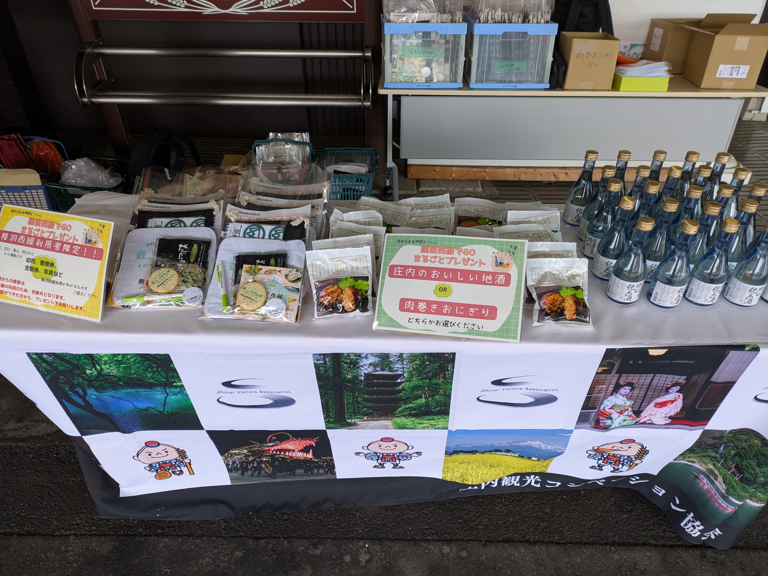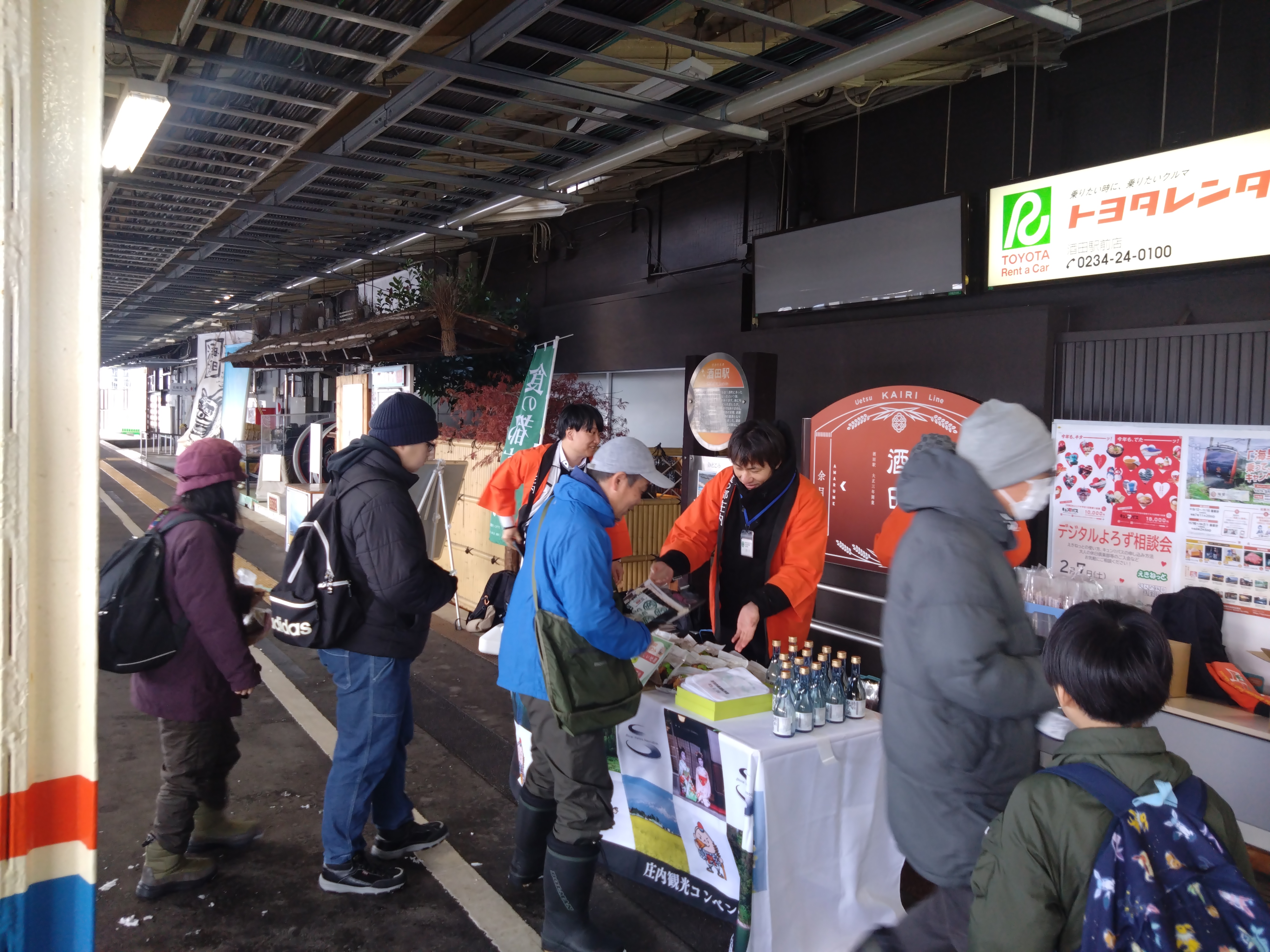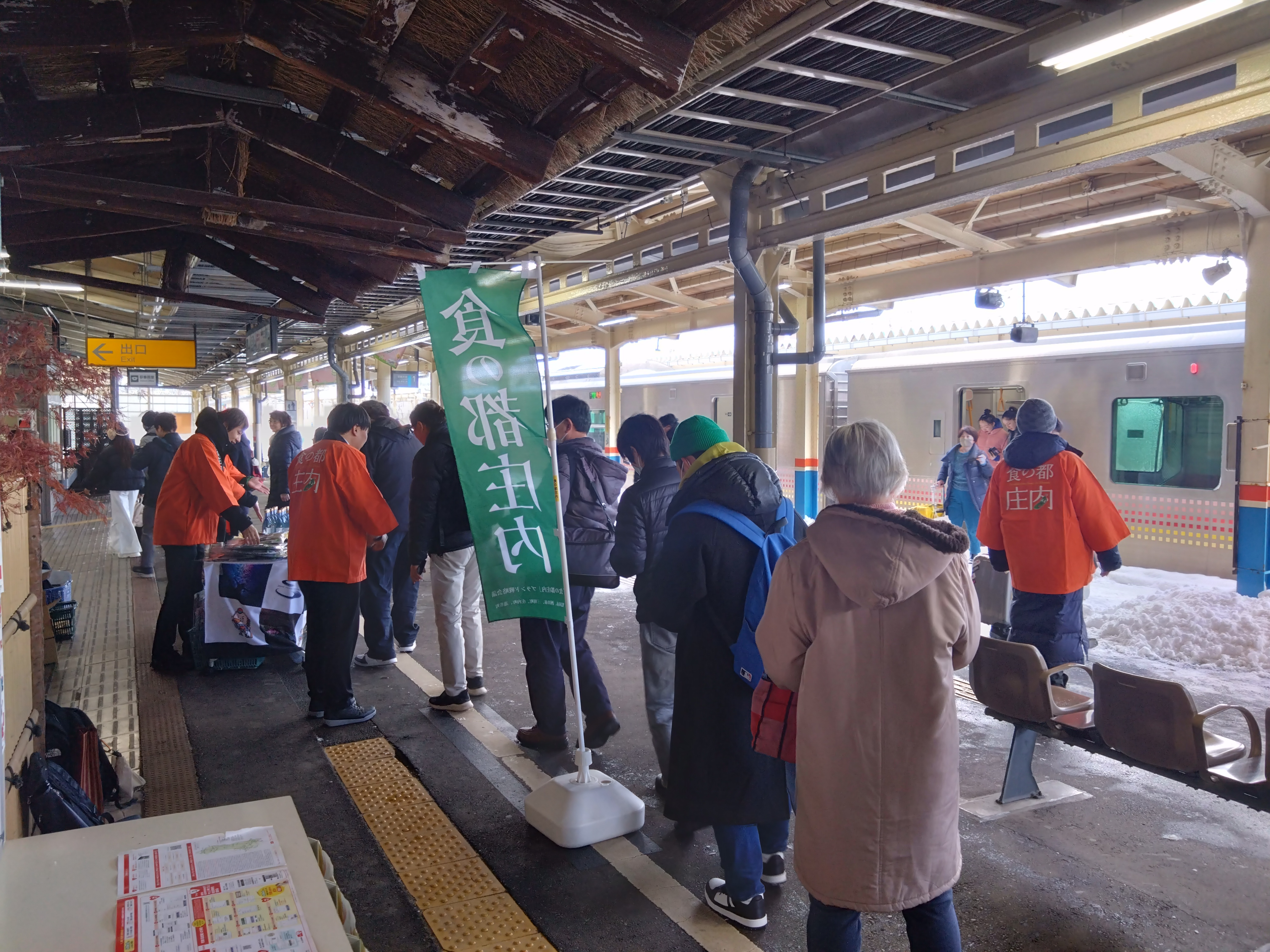 陸羽西線の対象列車(酒田駅11:37 着及び 12:24 着)に乗車して酒田日本海寒鱈まつりへ来場した方に、オリジナルの記念品が配布されました!