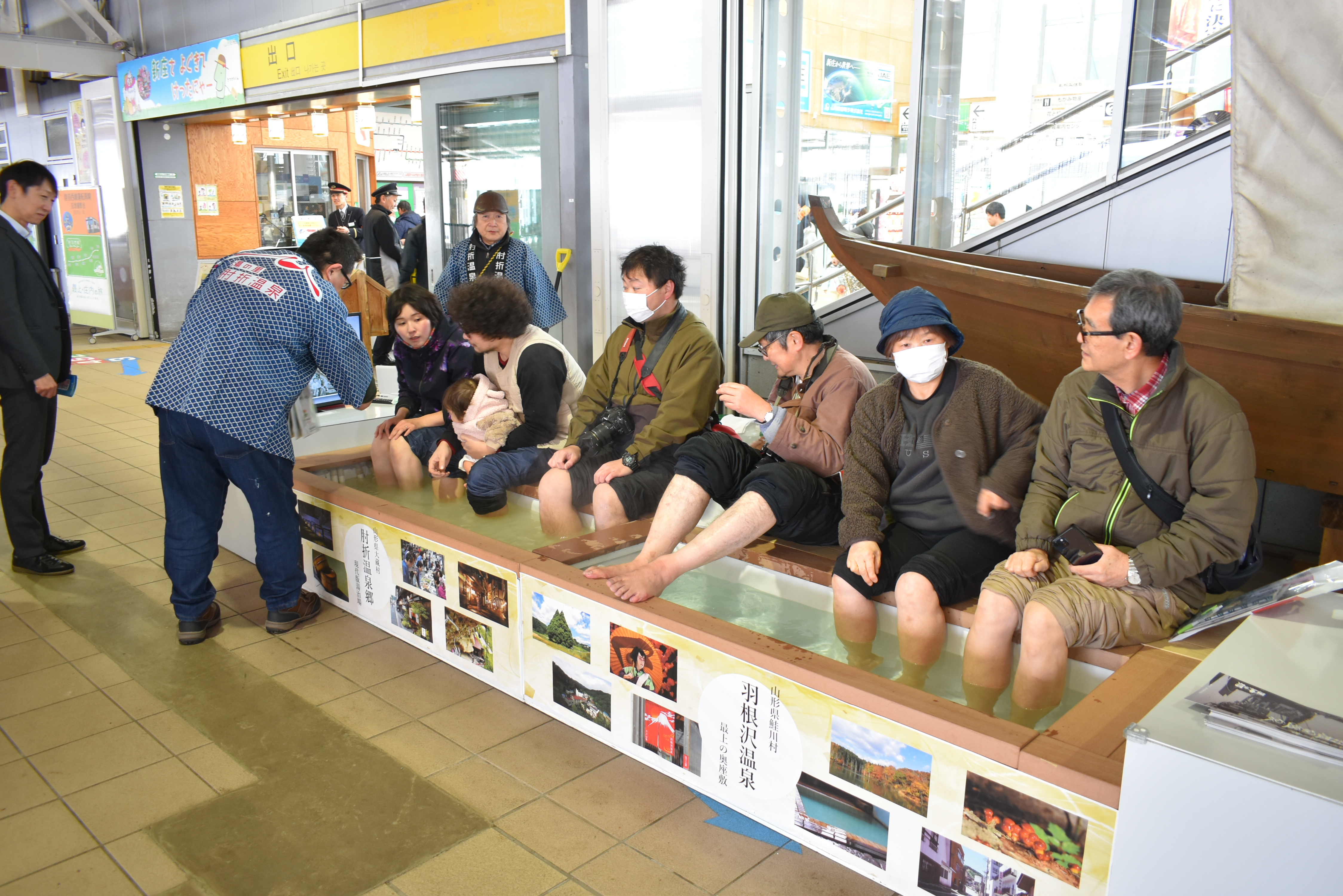 運転再開を祝して、「出発式、お出迎え・お見送り」、「ホームでの足湯イベント」、「東京発・人気スイーツ販売会」などを実施しました。