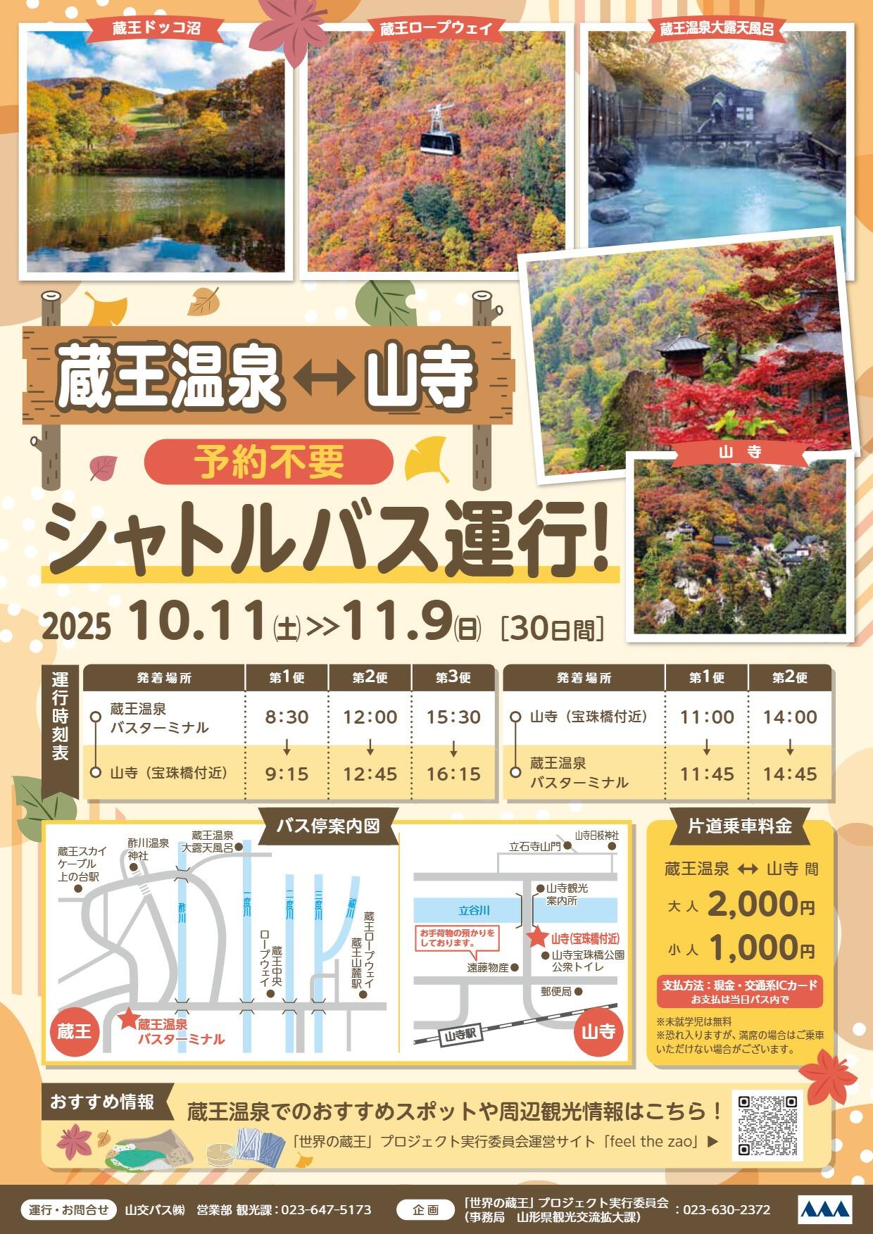 10月11日(土)より「蔵王温泉〜山寺」シャトルバスが運行されます。 山寺駅から徒歩約3分の宝珠橋付近のバス停からご利用いただけます。 蔵王温泉と山寺間の直行バスになりますので観光の際はぜひ当シャトルバスをご利用ください! 運行詳細は上記案内チラシをご確認ください。