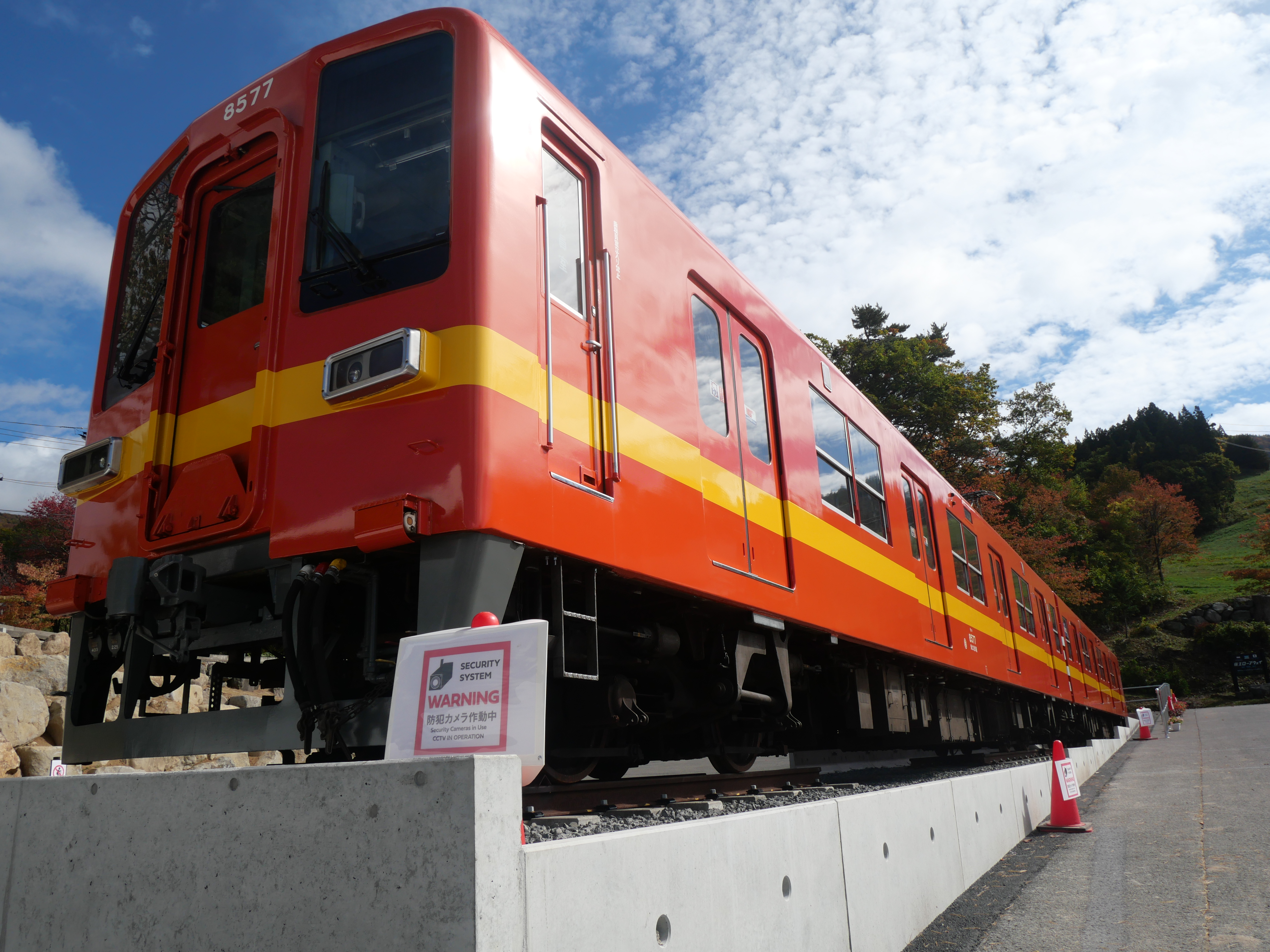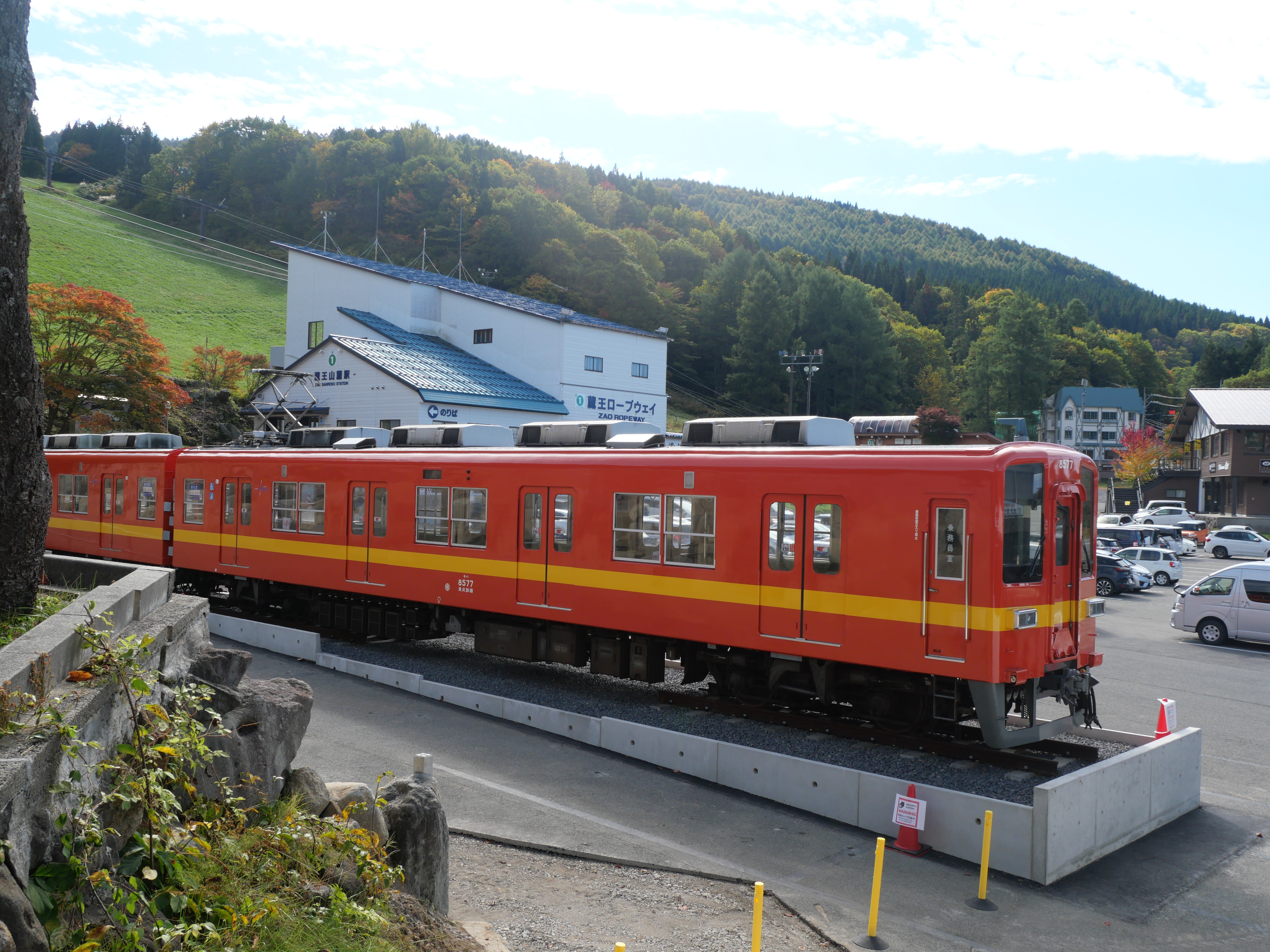 関東の東部鉄道で長年活躍してきた8000系車両(8577編成)が、蔵王ロープウェイの蔵王山麓駅駐車場に展示されました。