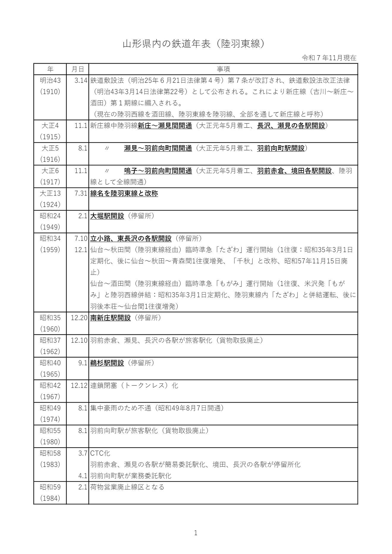 山形県内の鉄道年表(陸羽東線)
